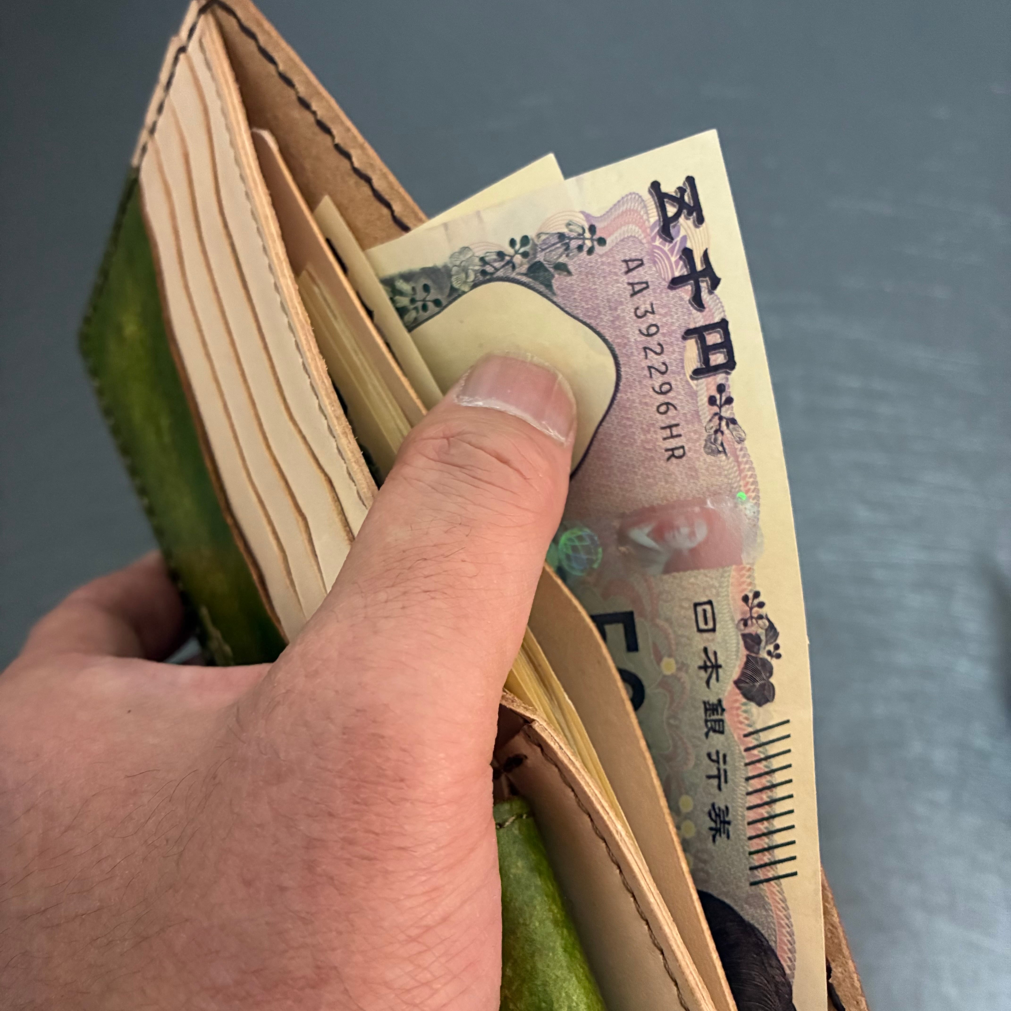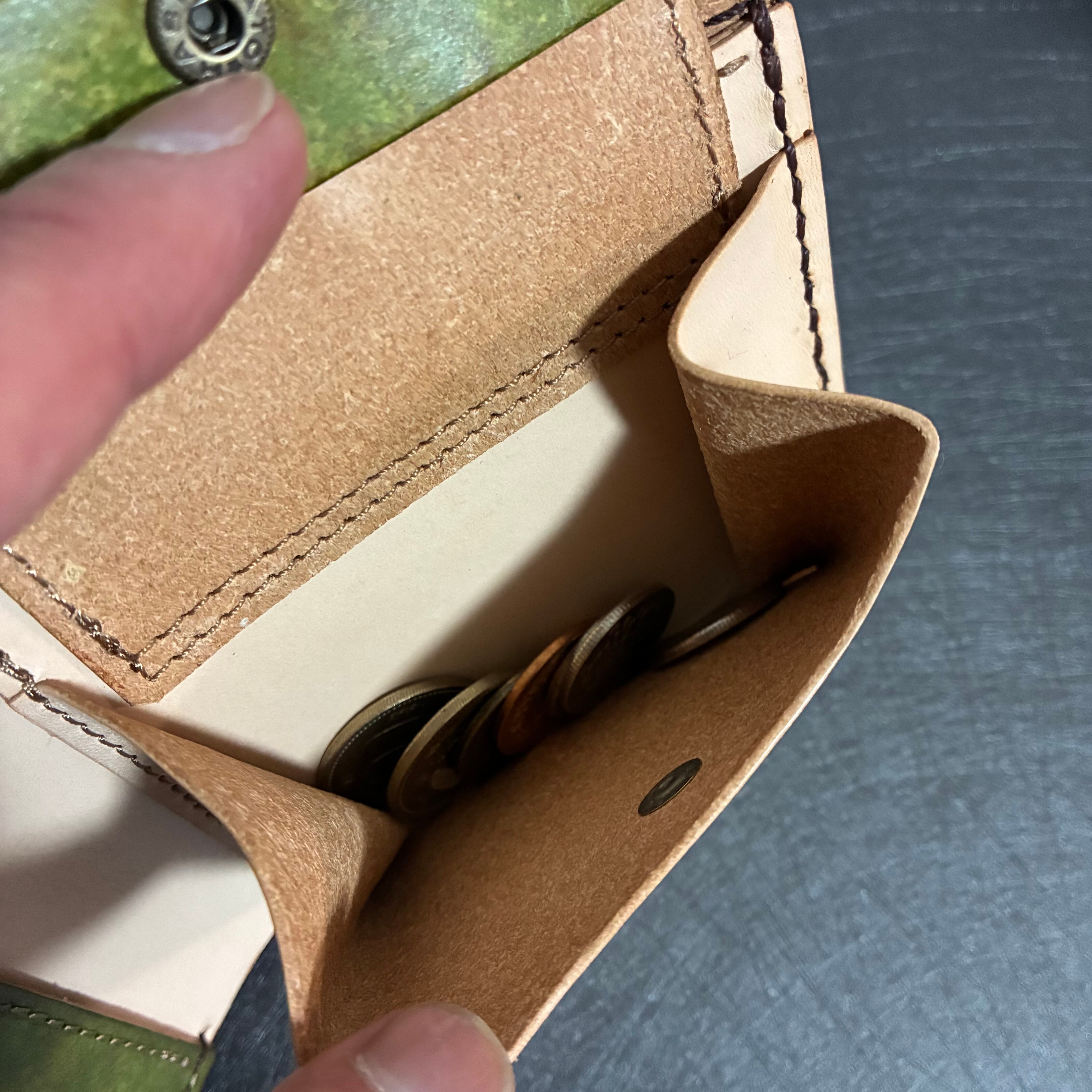 牛本革をオリーブ色と茶色で手染めした一点モノの革財布です。